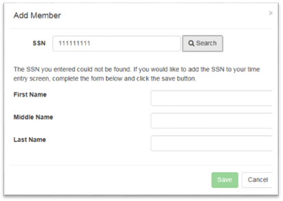 •Use the Add icon at the top of the page to add new employees to the pay period. You can search for the employee by SSN. If you do not find the employee by SSN, you have the ability to manually enter the employee by first and last name. After entering the information, Click the Save icon and the employee appears on the list in alphabetical order.